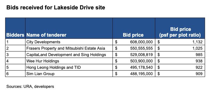 City Developments Limited (CDL) emerged as the top bidder for the Lakeside Drive site, submitting a bid 10.4% higher than the second-highest offer of $550.56 million ($1,025 psf ppr) by Frasers Property and Mitsubishi Estate Asia.